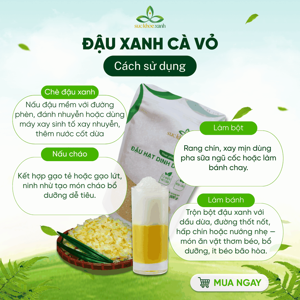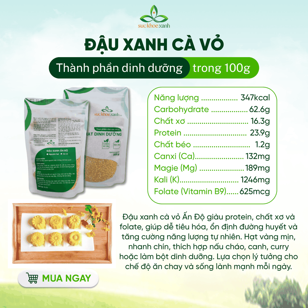 Đậu xanh chứa nhiều protein thực vật, chất xơ, vitamin nhóm B (B1, B2, B6), folate và các khoáng chất như sắt, kali, magie. Nhờ đó, đậu xanh giúp thanh nhiệt, hỗ trợ tiêu hóa, tăng cường miễn dịch, giảm cholesterol và ổn định đường huyết.