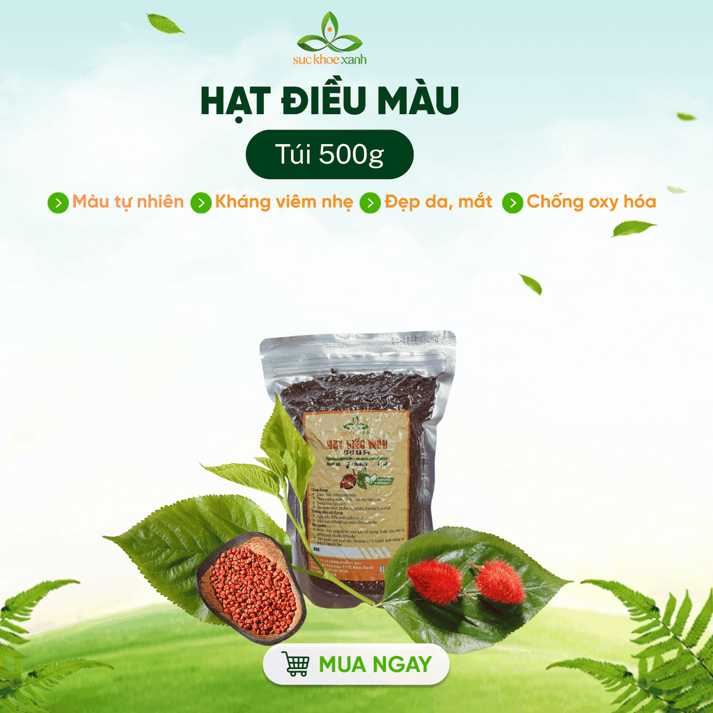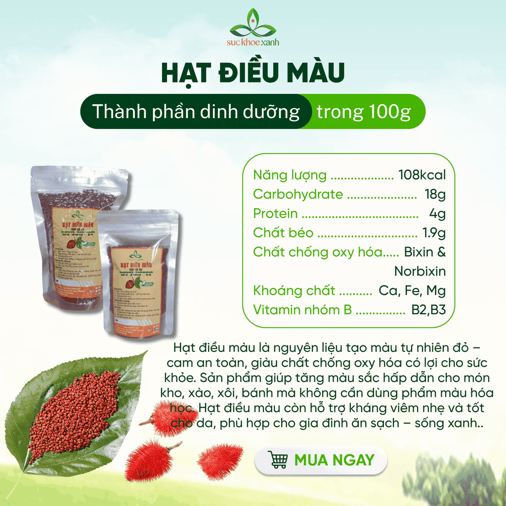 Hạt điều màu chứa hàm lượng cao carotenoid tự nhiên (bixine và norbixine) – chất chống oxy hóa giúp bảo vệ cơ thể trước gốc tự do, đồng thời tạo màu sắc bắt mắt. Ngoài ra, hạt còn bổ sung vitamin E, một lượng nhỏ chất xơ và khoáng chất như canxi, sắt, magie, hỗ trợ tăng giá trị dinh dưỡng trong chế độ ăn.