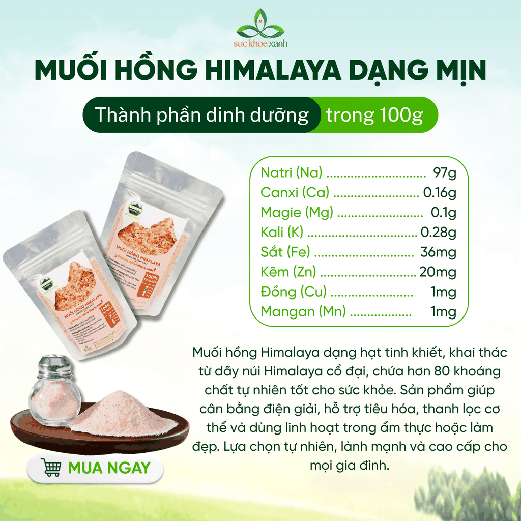Thành Phần Dinh Dưỡng: Muối Hồng Himalaya chứa hơn 80 loại khoáng chất và nguyên tố vi lượng quan trọng như sắt, canxi, magiê, và kali. Những thành phần này không chỉ tạo nên màu hồng đặc trưng mà còn cung cấp nhiều lợi ích sức khỏe.