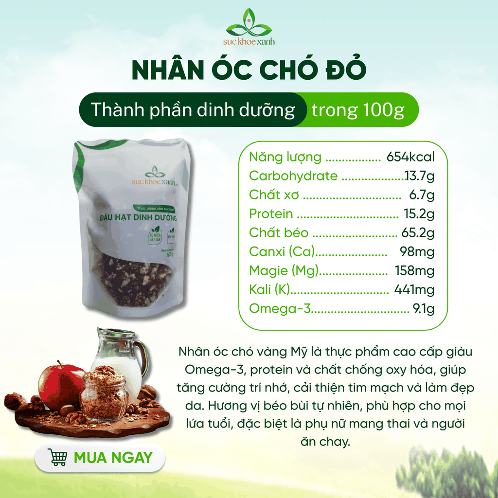 Quả óc chó đỏ là loại hạt dinh dưỡng cao cấp, nổi bật với màu sắc đỏ tự nhiên và hương vị độc đáo. Giàu axit béo omega-3, chất xơ, protein, cùng nhiều vitamin và khoáng chất, quả óc chó đỏ không chỉ là món ăn ngon mà còn là nguồn dinh dưỡng tuyệt vời. Sản phẩm không chứa hóa chất và chất bảo quản, đảm bảo an toàn cho sức khỏe người tiêu dùng.